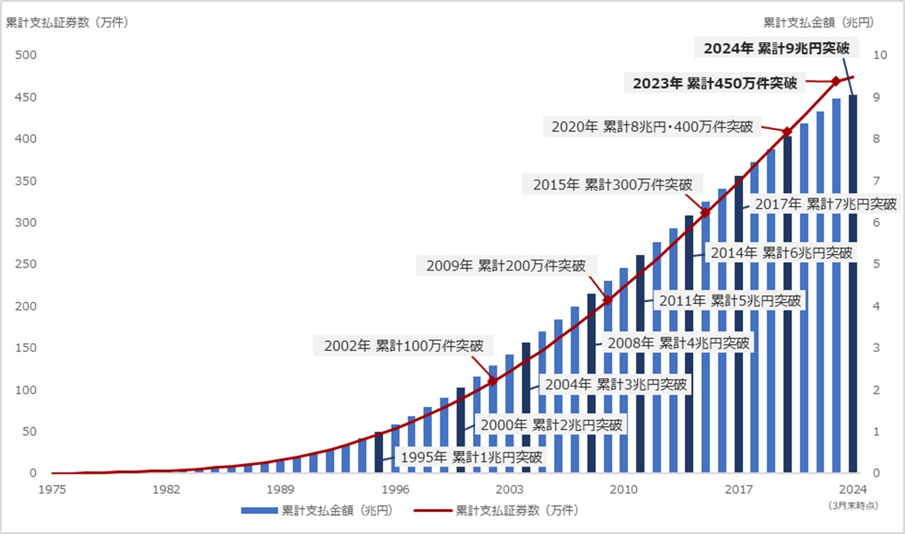 当社は、1974年に日本初のがん保険とともに創業し、翌年5月に初めて給付金をお支払いしました。それ以降、当社がお客様にお届けした保険金・給付金等の累計額は、1978年に100億円(累計支払証券数 約8,000件)、1985年に1,000億円(同7万件)、1995年に1兆円(同47万件)を超え、その後も多くのお客様に保険金・給付金等をお届けしてきました。そして今年3月末には、累計450万件を超えるご契約についてお支払いした保険金・給付金等の累計支払金額が9兆円を突破しました。