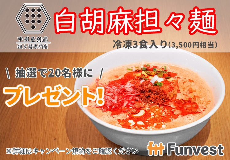 対象ファンドにお申込みの方の中から抽選で20名様に「甲州屋別邸 白胡麻担々麵」をプレゼント!