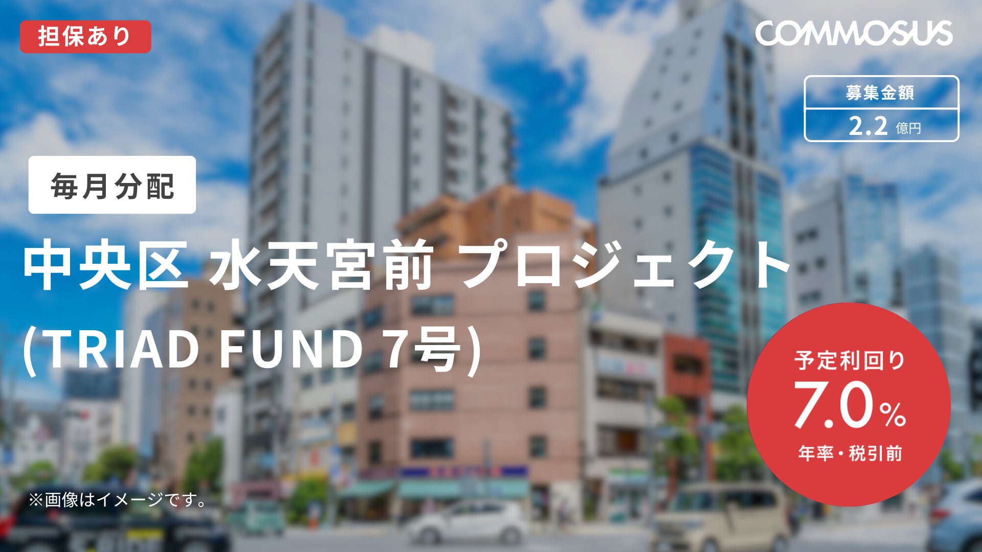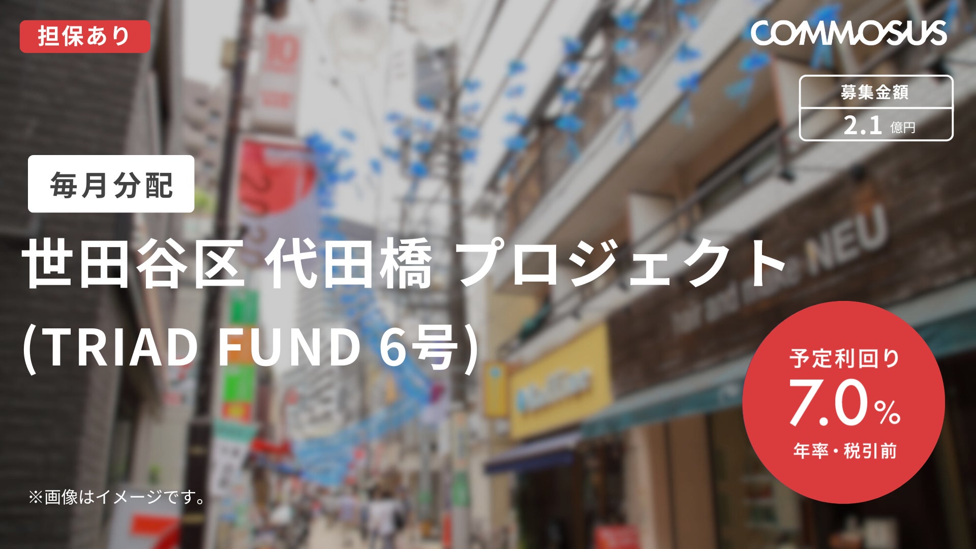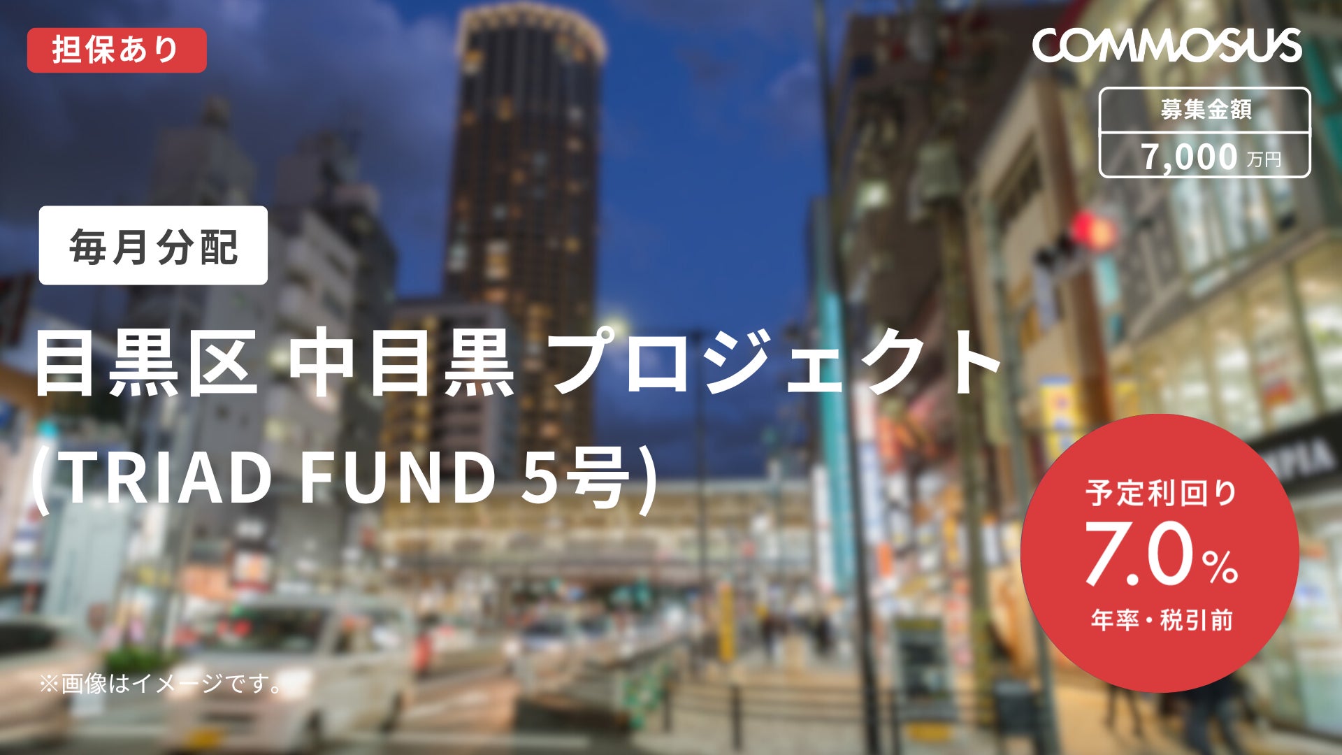 株式会社SOCIAL COMMON CAPITAL( 本社:東京都港区 / 代表取締役:大畑 広太 )のグループ会社である株式会社コモサス(本社:東京都港区 / 代表取締役:加藤 義隆 )にて運営する融資型(貸付型)クラウドファンディング「COMMOSUS(コモサス)」は、事業提携先となる株式会社TRIAD(本社:東京都港区 / 代表取締役:倉持 正之)が借入人となる「目黒区 中目黒 プロジェクト (TRIAD FUND 5号)」「世田谷区 代田橋 プロジェクト (TRIAD FUND 6号)」「中央区 水天宮前 プロジェクト (TRIAD FUND 7号)」3ファンドを2024年5月30日より同時募集することをお知らせいたします。これら3つのファンドは全て、貸付先から毎月利払いを受け、投資家の皆様に毎月分配する仕組みとなっており、分配は運用開始月の翌々月から開始されます。