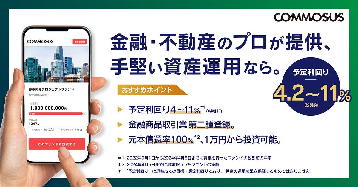 COMMOSUSは、金融・不動産のプロが厳選した資産に1万円から投資ができるオンラインプラットフォームです。融資型(貸付型)クラウドファンディングの仕組みを通じ、不動産ファンドを中心に1万円からの少額にて誰でも手間なく投資を始めることができます。2019年9月のサービス開始から2024年4月までに募集を行ったファンドの元本償還率は100%となり、予定利回り4.2〜11.0%(*1)となります。