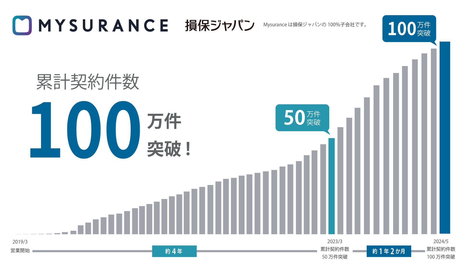 Mysuranceは2019年3月に営業を開始し、2023年3月に50万件を突破しました。その後、更に契約件数を積み上げた結果、約1年2か月で累計契約件数100万件を突破しました。