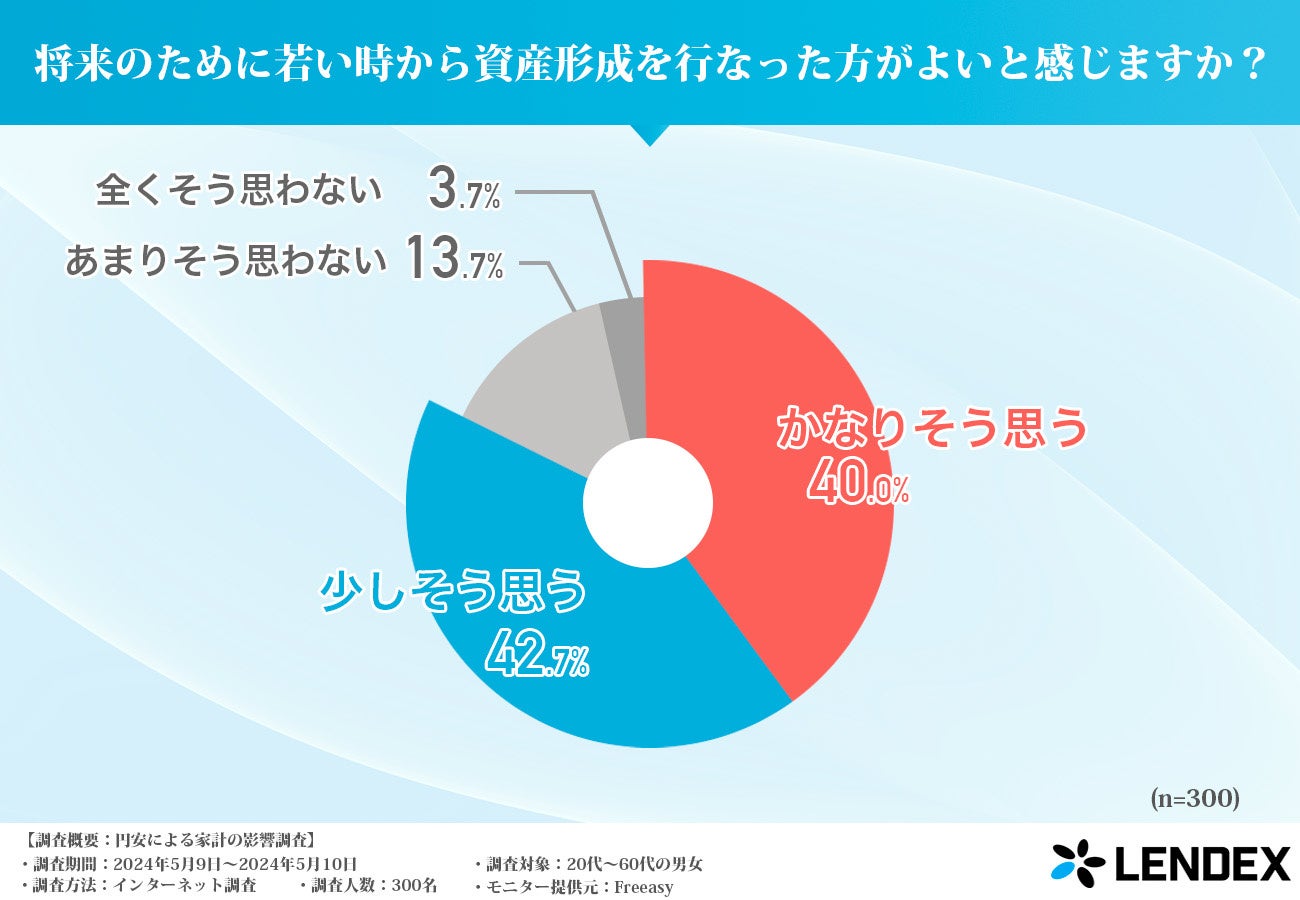 「将来のために若い時から資産形成を行なった方がよいと感じますか?」と質問したところ、「かなりそう思う」40%「少しそう思う」42%と、8割以上の方がそう思うと回答しました。