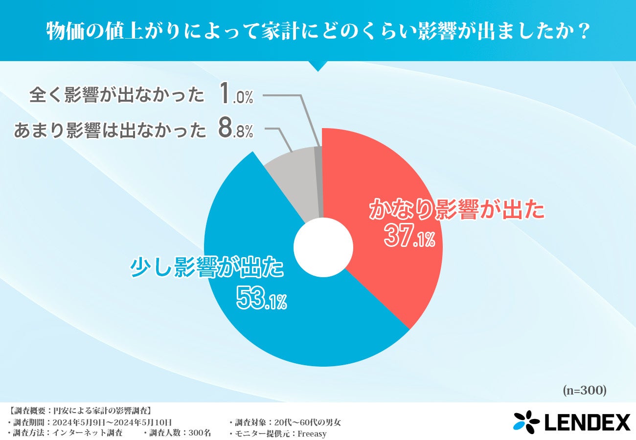 「物価の値上がりによって家計にどのくらい影響が出ましたか?」と質問したところ、37%が「かなり影響が出た」53%が「少し影響が出た」と回答しており、9割以上が家計への影響を感じています。