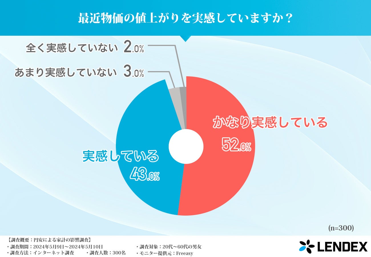 「最近物価の値上がりを実感していますか?」と質問したところ、52%が「かなり実感している」43%が「実感している」と、合わせて95%が方が実感していると回答しました。