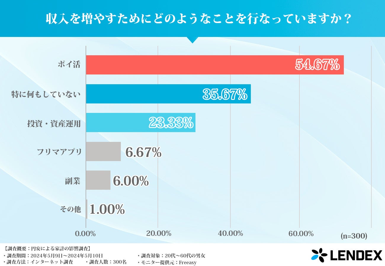 「収入を増やすためにどのようなことを行なっていますか?」と質問したところ、「ポイ活」と回答した方が最も多く(55%)、続いて投資・資産運用と回答した方が23%でした。