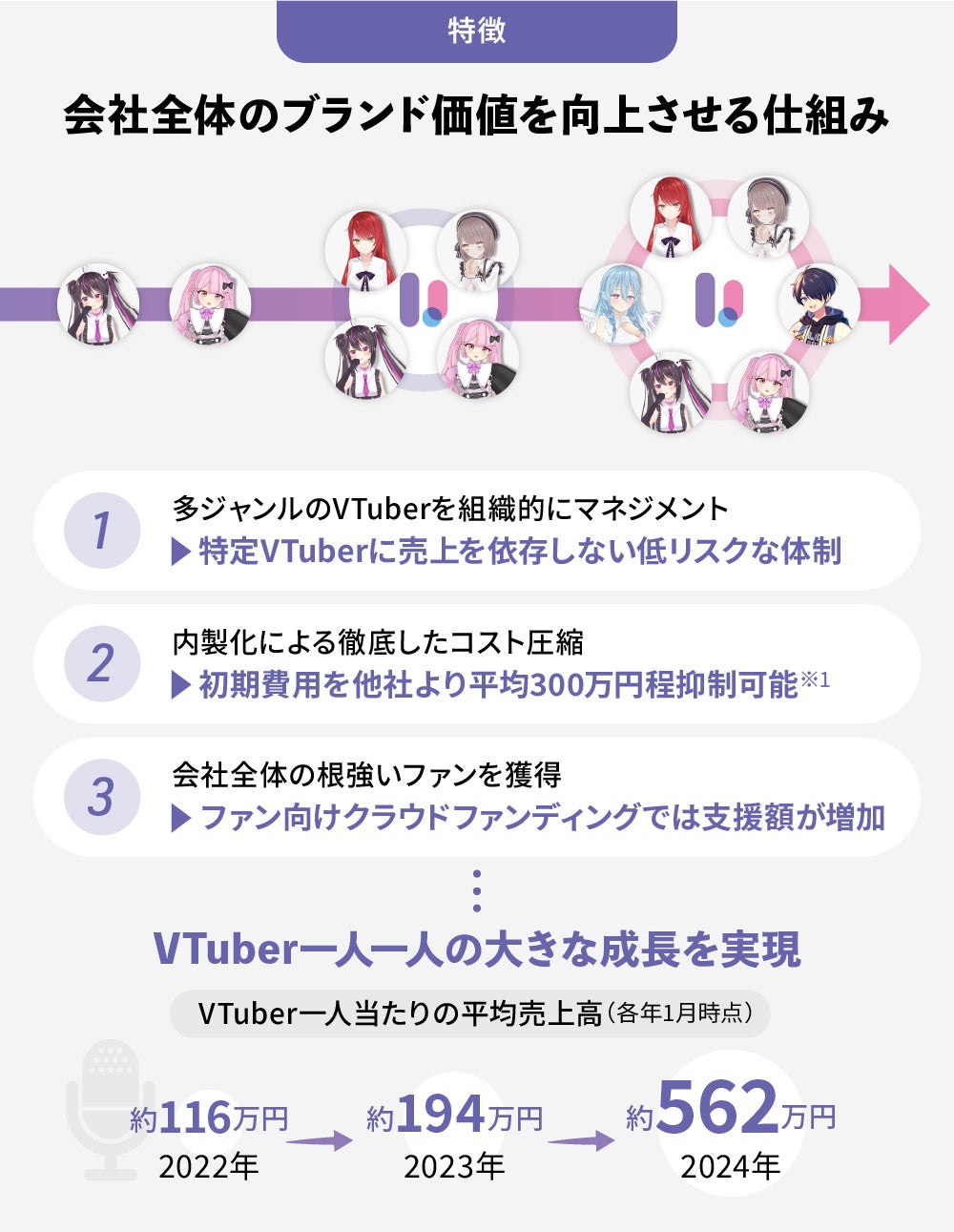 代表は元人気YouTuberのマネージャー。ゼロからマネジメントに関わり、チャンネル登録者を数十万人に育てた実績 ・育成力が強みで、VTuber1人当たり売上高は直近2年で約5倍に成長。