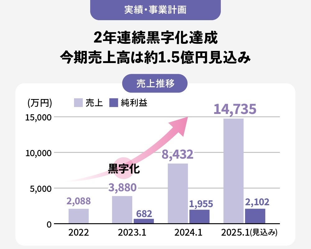 売上高は直近2年で4倍以上に成長し、前々期より黒字化を達成。今期は売上高前期比約1.7倍・黒字での着地を計画 ・今後はイベントやコマース等IP活用ビジネスに注力。アジアや欧米への展開も進め、2027年IPO準備開始を計画