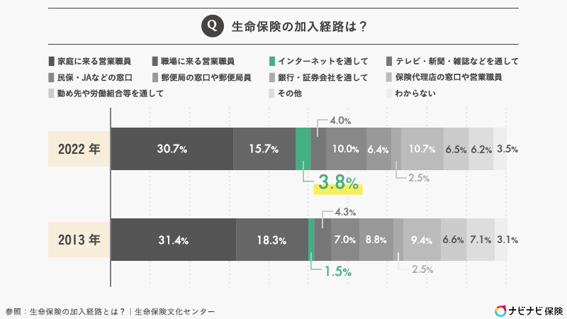 近年、インターネットを通じた保険の情報収集や加入が増えています。生命保険文化センターの調査*によれば、2013年から2022年の間にインターネットで保険に加入した人は約2.5倍に増加しています。