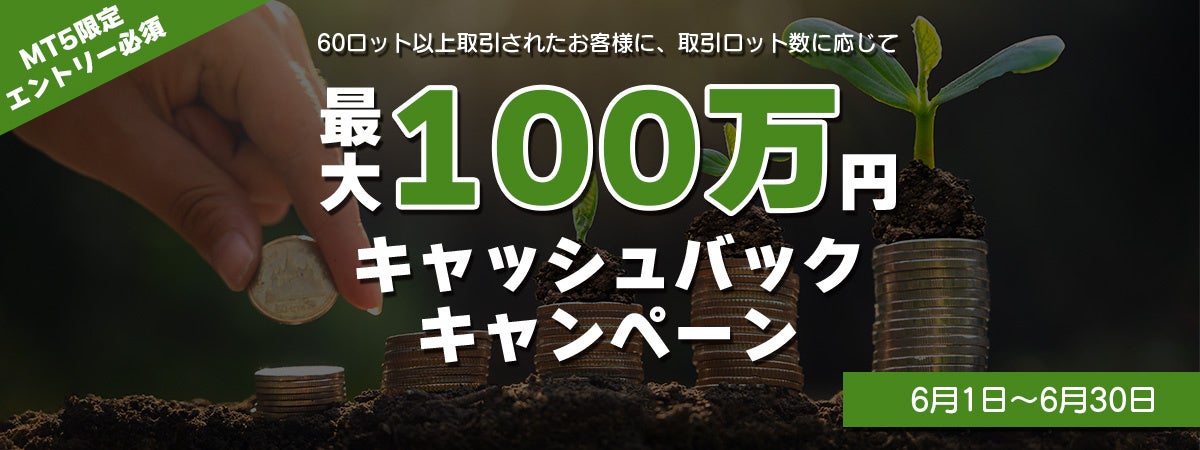 • 最大100万円キャッシュバックキャンペーン(MT5/MT4個人・法人対象)