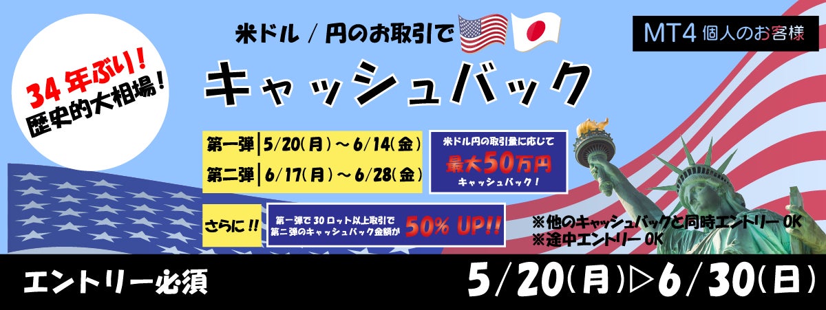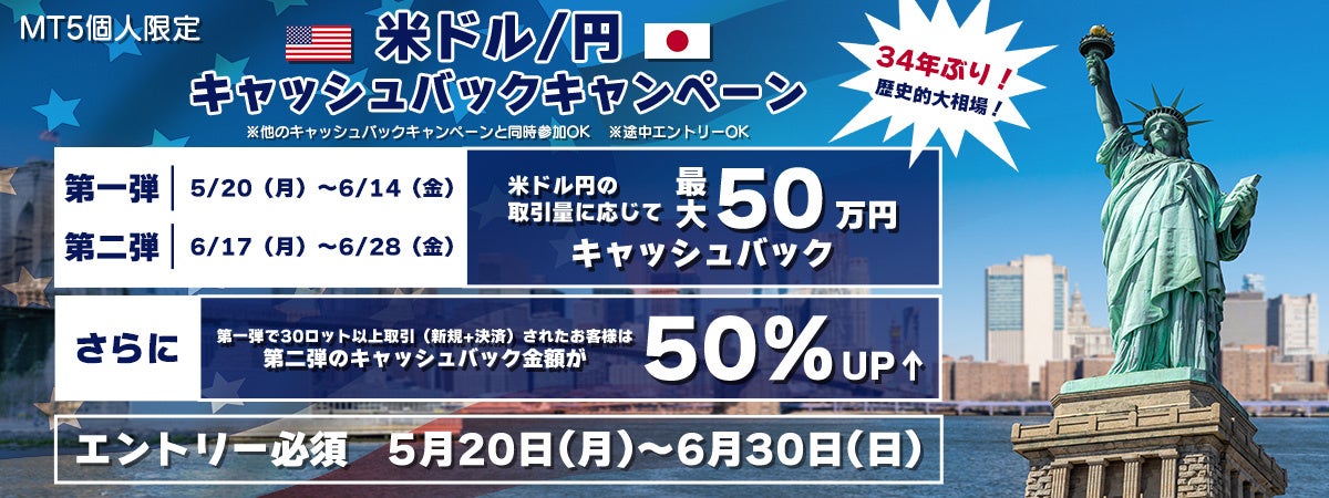 米ドル/円キャッシュバックキャンペーン(MT5/MT4個人対象)