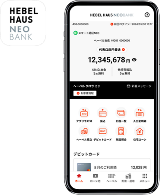 「ヘーベルNEOBANK」は、HEBELIAN NET.会員*2のかたにむけた銀行サービスです。口座開設をはじめ、住信SBIネット銀行が提供する預金・振込・ATMなどの日々の銀行サービスまでのすべてをスマートフォンアプリで完結することが可能です。