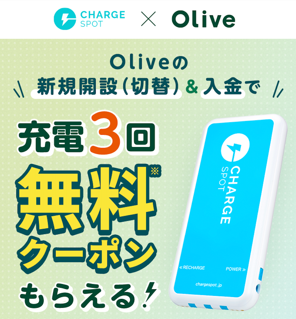 キャンペーン期間は2024年6月3日(月)〜7月5日(金)まで。Oliveアカウントの新規開設(切り替え含む)かつ、3万円以上の口座入金で「ChargeSPOT」の3時間無料クーポンコード、3回分が配布されます。