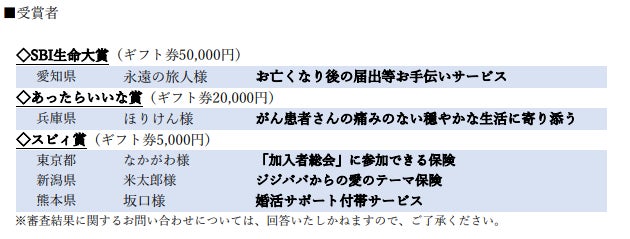 く御礼申し上げます。ご応募いただいた中からSBI 生命大賞には、現実的なニーズの声も多い「お亡く