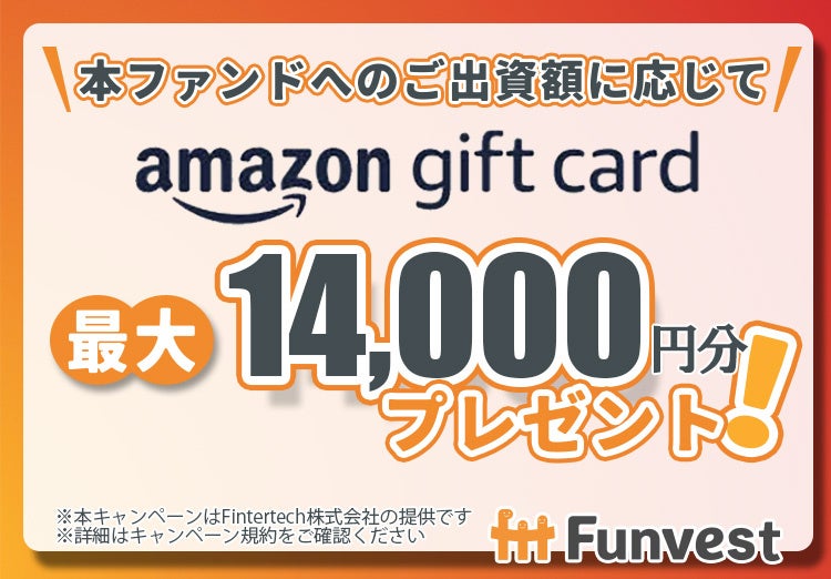 本ファンドへ出資していただいた投資家の皆様を対象として、出資額に応じて最大14,000円分のAmazonギフトカードをプレゼントするキャンペーンも併せて実施いたします。