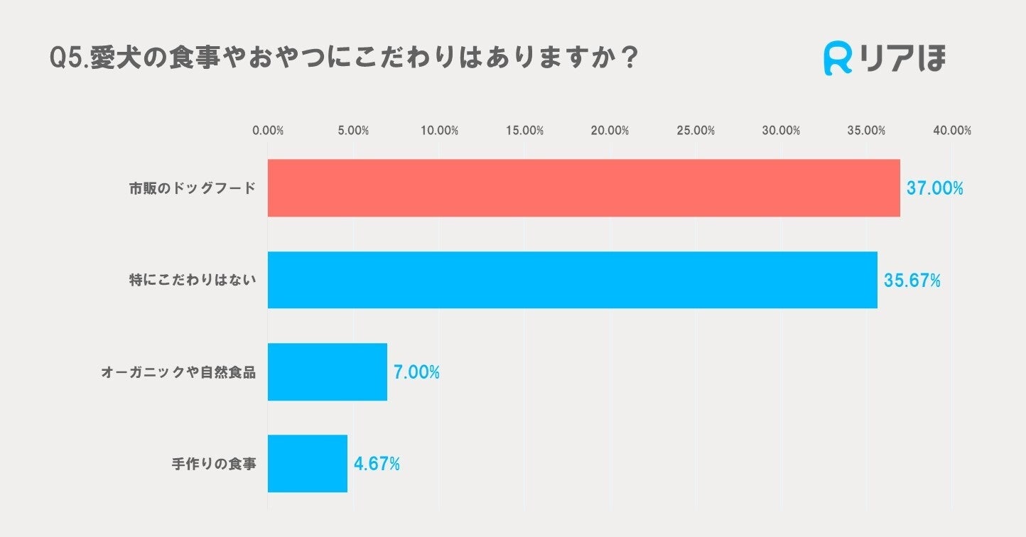 愛犬の食事やおやつについて、最も多かったのは「市販のドッグフード」で37.00%でした。次いで「特にこだわりはない」が35.67%、「オーガニックや自然食品」が7.00%、「手作りの食事」が4.67%という結果でした。多くの飼い主が市販のドッグフードを利用しており、特にこだわりを持たない飼い主も多いことが示されています。一方で、オーガニック食品や手作り食事にこだわる飼い主も一定数存在し、健康志向の高い飼い主も見受けられました。
