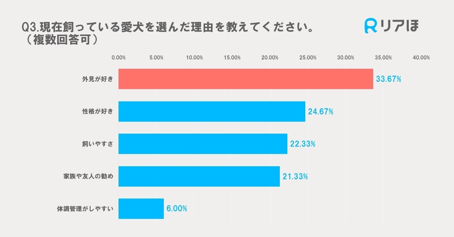愛犬を選んだ理由について、最も多かったのは「外見が好き」で33.67%でした。次いで「性格が好き」が24.67%、「飼いやすさ」が22.33%、「家族や友人の勧め」が21.33%という結果でした。飼い主が愛犬を選ぶ際には、外見や性格が大きな要因となっていることがわかります。