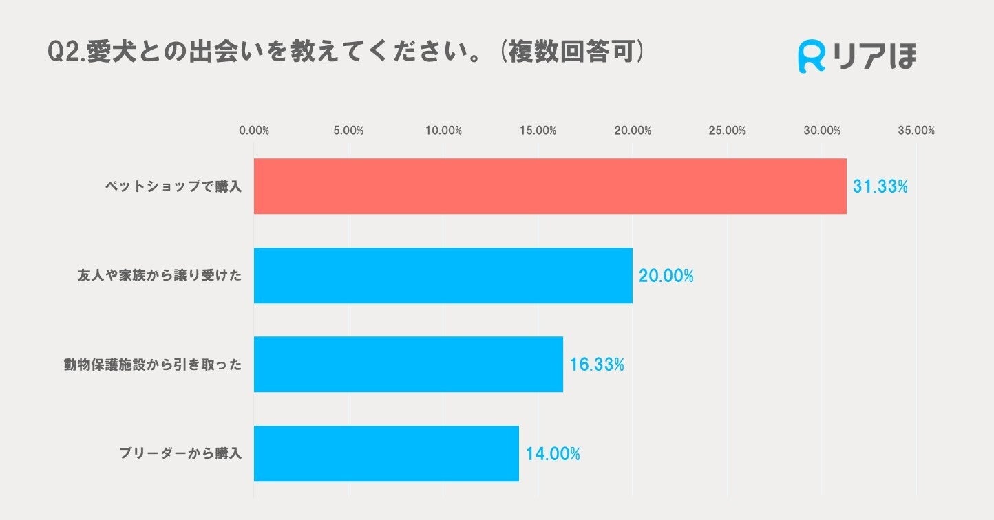 愛犬との出会いについて、最も多かったのは「ペットショップで購入」で31.33%でした。次いで、「友人や家族から譲り受けた」が20.00%、「動物保護施設から引き取った」が16.33%、「ブリーダーから購入」が14.00%という結果でした。