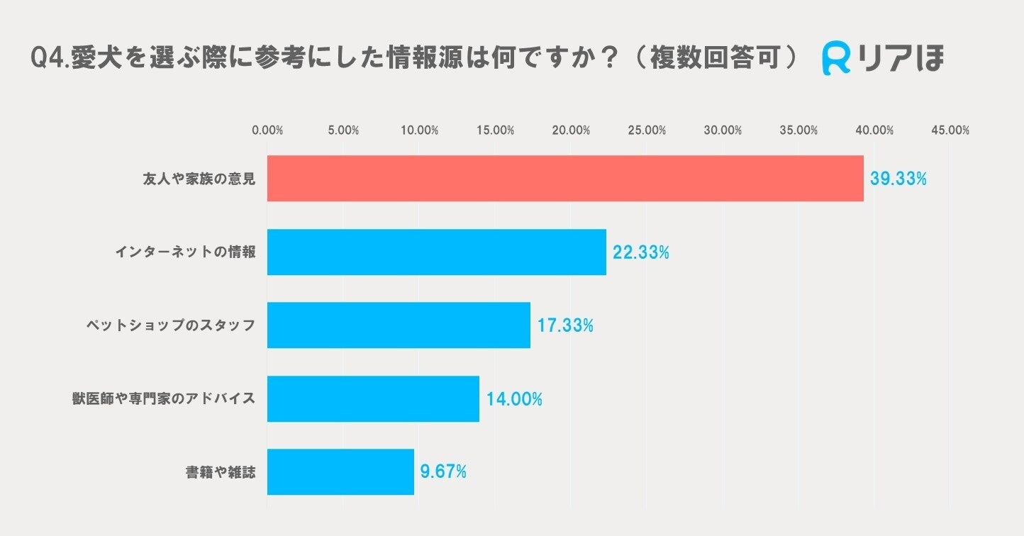 愛犬を選ぶ際の情報源について、最も多かったのは「友人や家族の意見」で39.33%でした。次いで「インターネットの情報」が22.33%、「ペットショップのスタッフ」が17.33%、「獣医師や専門家のアドバイス」が14.00%という結果でした。