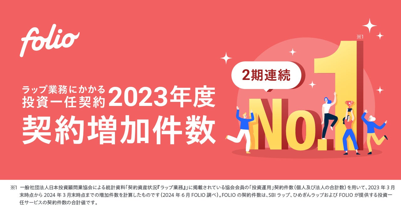 株式会社FOLIO(東京都千代田区、代表取締役:四元 盛文、以下FOLIO)は、ラップ業務にかかる投資一任契約で、2023年度通期(2023年4月1日~2024年3月31日)において契約増加件数第1位※1となったことをお知らせします。なお当社は2022年度通期においても契約増加件数第1位となっており、2期連続での第1位となりました。