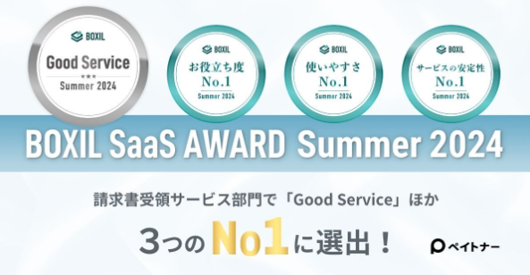 今回「ペイトナー請求書」が受賞した、請求書受領サービス部門の「Good Service」は、「BOXIL SaaS」上に投稿された口コミを対象に、各カテゴリで総得点の高いサービスに対して与えられる称号です。