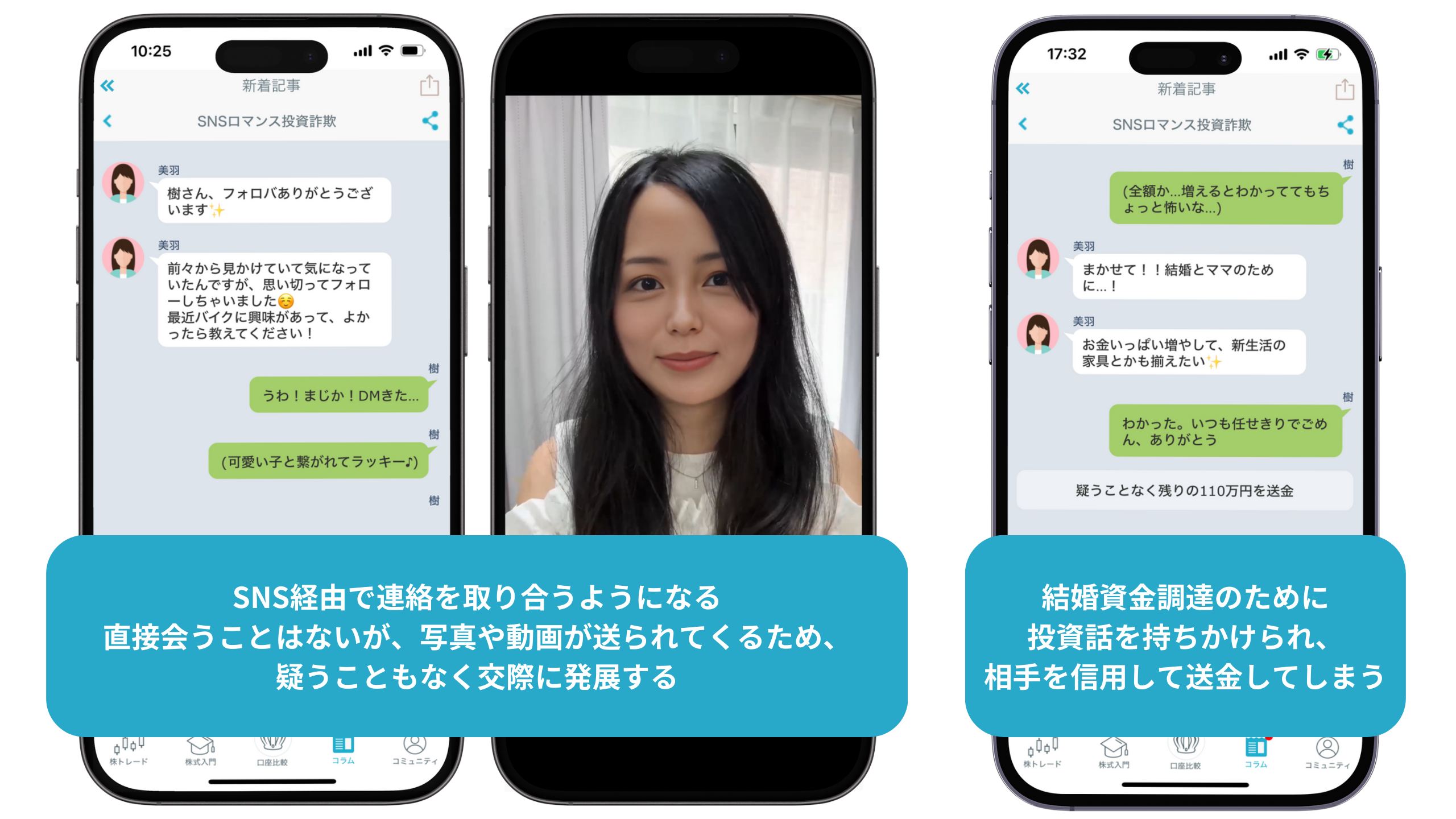「SNSロマンス詐欺」編では、主人公の男性が、SNSでのフォローをきっかけに女性と知り合うところから始まり、連絡を取り合ううちに交際に発展します。やがて、結婚資金を調達するために投資話を持ち掛けられ、貯金の全額をだまし取られてしまうというエピソードになっています。相手から送られてくる写真や動画を信じて、一度も会ったことがないにもかかわらず、疑うことなく関係が深まりますが、これらの写真や動画は生成AI技術を利用したディープフェイクであり、実際は本人のものではありませんでした。