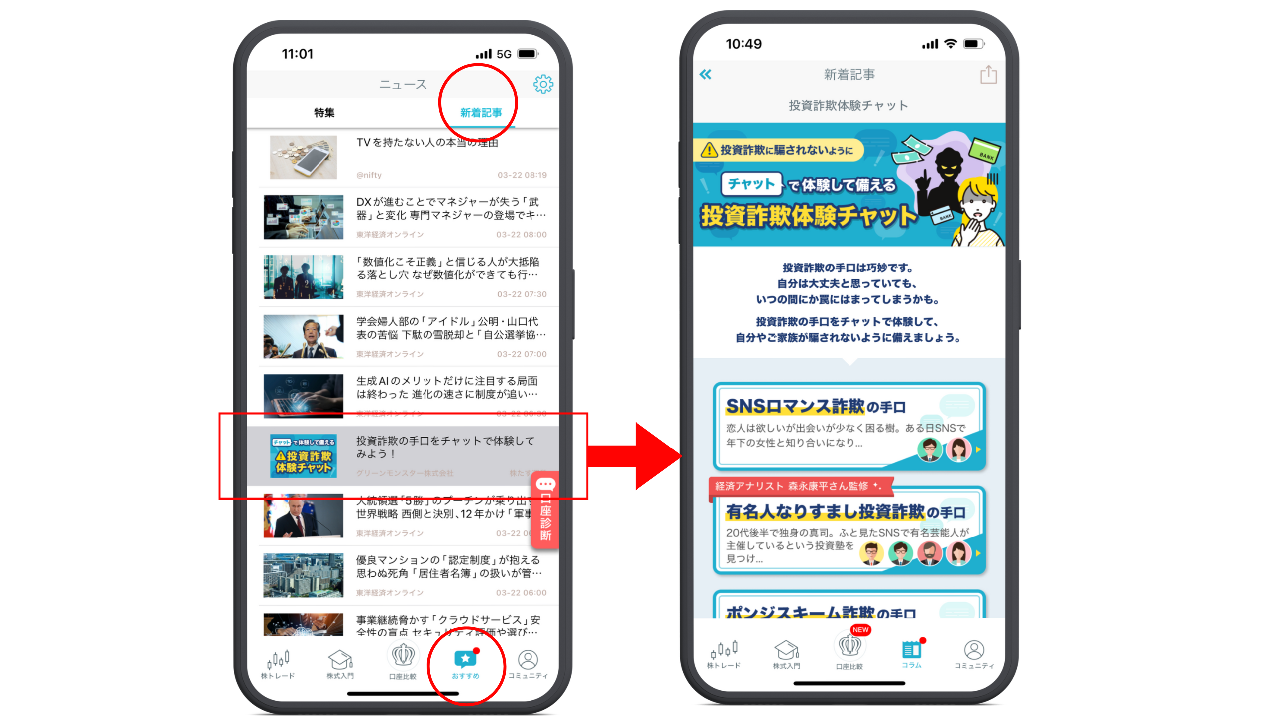 「株たす」アプリ内下部「おすすめ」画面の上部タブ「新着記事」より、「投資詐欺体験チャット」がご覧いただけます。