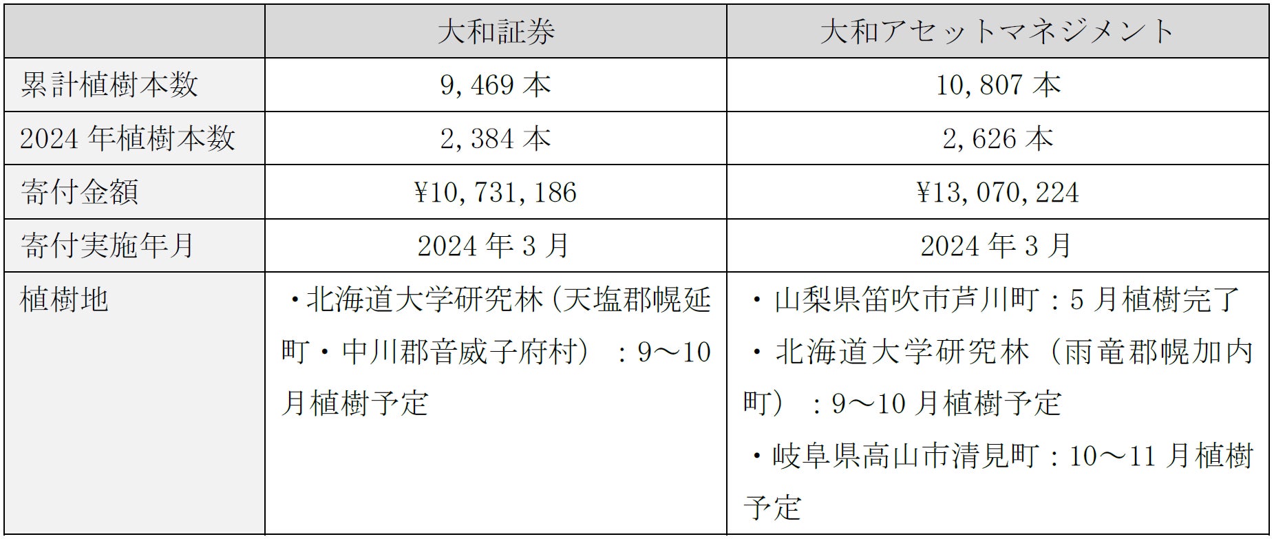 ・大和証券グループ本社と大和アセットマネジメントのHP上で、寄付の実績 (日付、寄付額)をご報告 ・大和アセットマネジメントが発行する対象ファンドのファンドレターで植樹活動や森が育つ過程をご報告 |