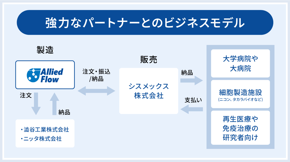 当社は、フローサイトメトリー技術を基に自社で無菌操作に耐えうるセルソーターの開発及び製造を行っています。無菌操作や滅菌技術は、産総研やパートナー企業とのアライアンスを通じて技術開発を進めています。無菌関連部品の製造は外部に委託しています。販売は、細胞医療に関わる研究施設とのネットワークを持つ販売代理店との非独占販売契約に基づき、大学や細胞研究施設、細胞治療の研究者(再生医療・免疫医療)に対して行っています。
