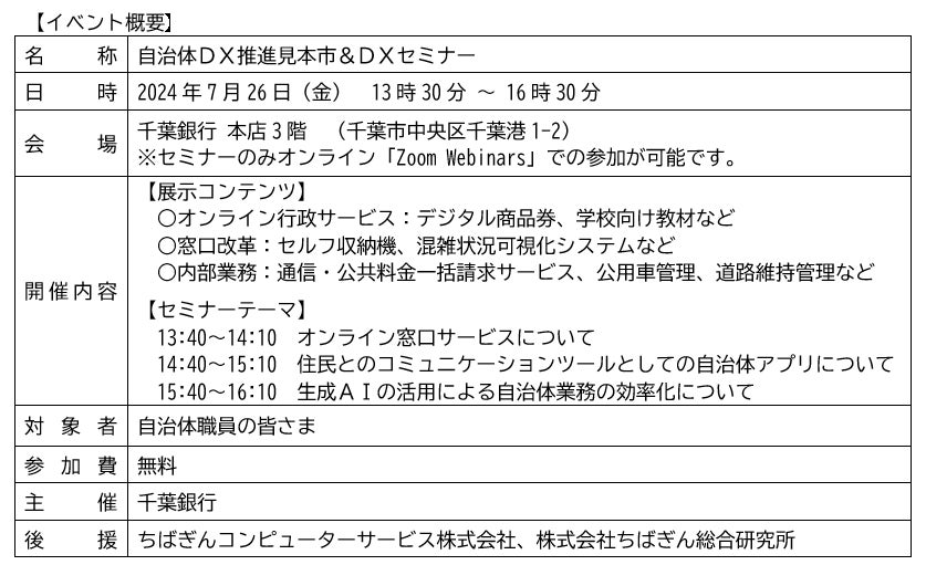 千葉銀行(頭取 米本 努)は、2024年7月26日(金)、デジタル技術の活用による行政サービスの高度化を支援するため、「自治体DX推進見本市&DXセミナー」を開催します。