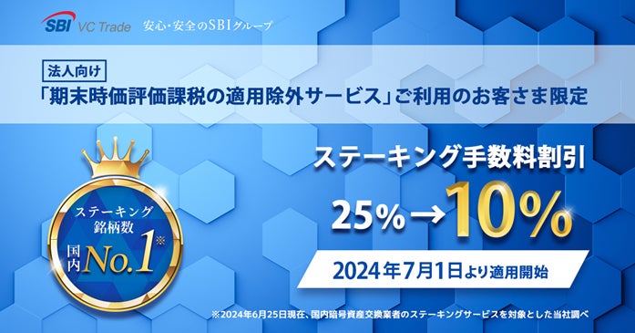 SBI VCトレード株式会社(本社:東京都港区、代表取締役社長:近藤 智彦、以下「当社」)は、2024年7月1日(月)より、法人向け「期末時価評価課税の適用除外サービス」ご利用のお客さまに限定で、ステーキング手数料の割引(現状25%→本制度ご利用後10%)を実施することをご案内いたします。