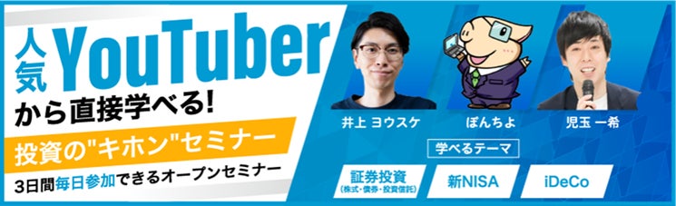 人気YouTuberから、”キホン”について直接学べます。本セミナーは事前申込が不要で、会場はオープンなつくりになっていますので、制度について具体的な話が聞きたい方は、気軽に参加することができます。新NISA以外にも、証券投資やiDeCoの”キホン”についても学べます。