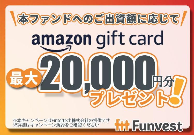 本ファンドへ出資していただいた投資家の皆様を対象として、出資額に応じて最大20,000円分のAmazonギフトカードをプレゼントするキャンペーンも併せて実施いたします。