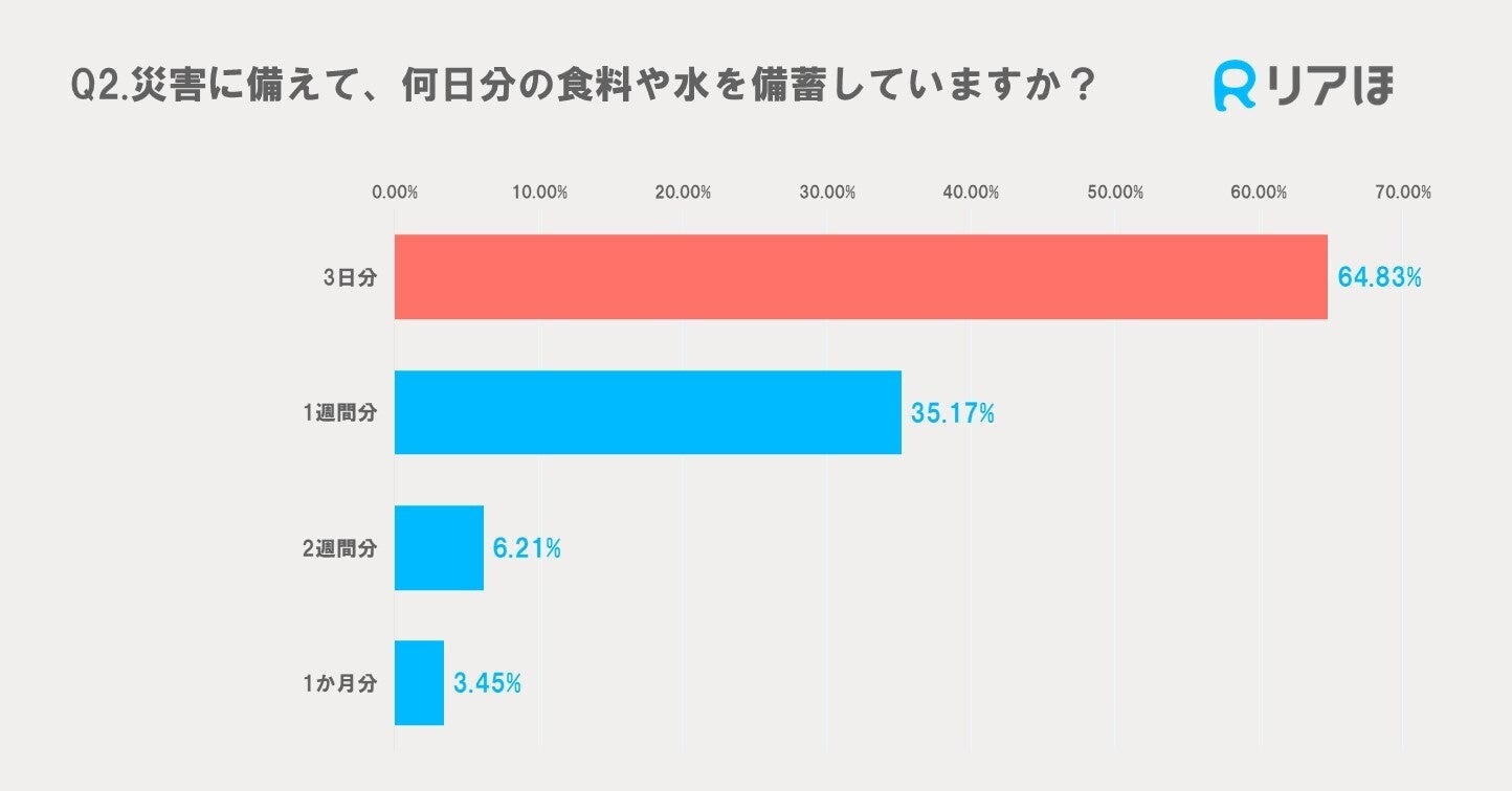 3日分の備蓄をしている人が64.83%と最も多く、1週間分の備蓄をしている人は35.17%でした。2週間分や1か月分の備蓄をしている人は少数派で、それぞれ6.21%と3.45%でした。