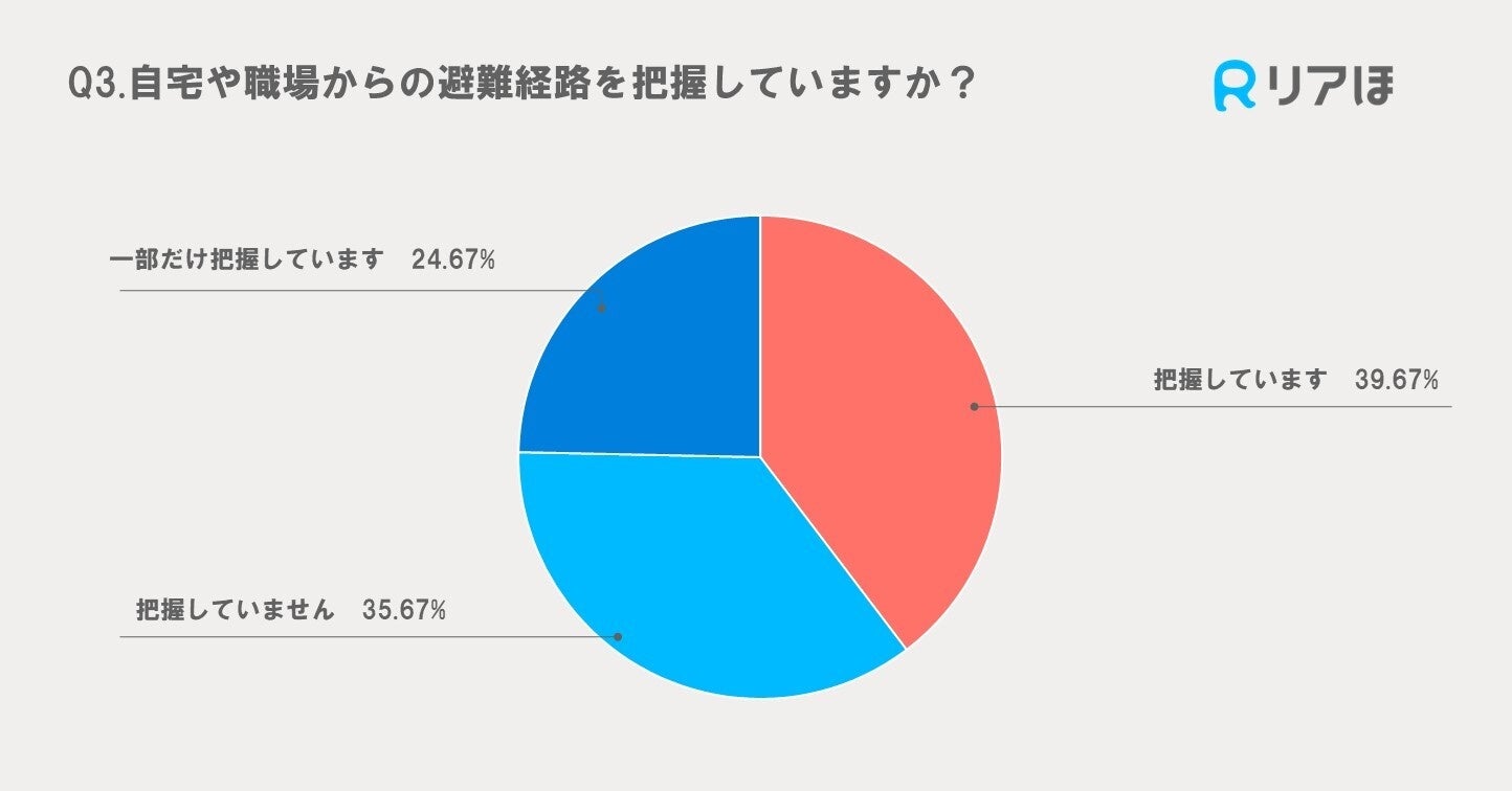 避難経路を把握していると回答した人は39.67%、一部だけ把握している人は24.67%、把握していない人は35.67%でした。この結果から約3割以上の方が避難経路を全く把握していないことが明らかになりました。