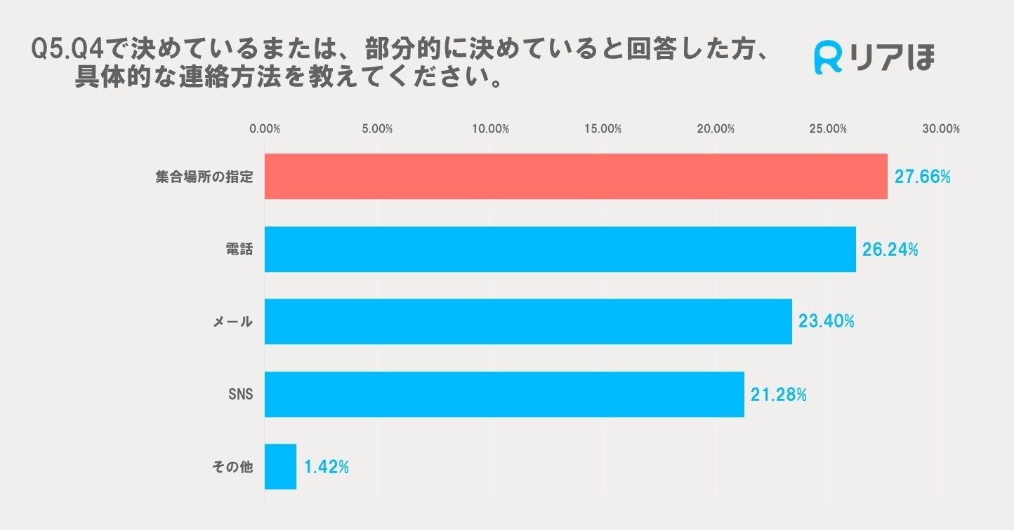 具体的な連絡方法としては、集合場所の指定が27.66%と最も多く、次いで電話が26.24%、メールが23.40%、SNSが21.28%という結果でした。