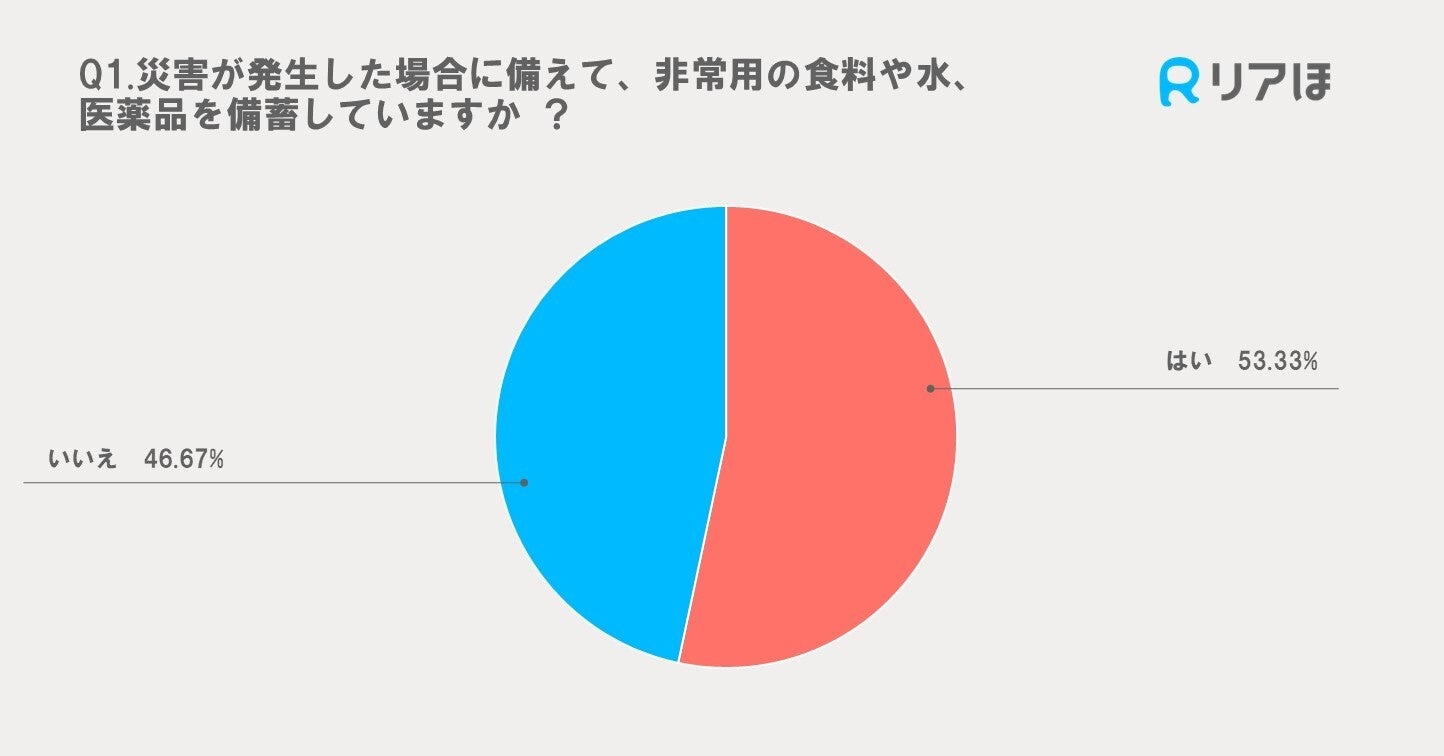 この質問に対して、53.33%の回答者が「はい」と答え、46.67%が「いいえ」と回答しました。半数以上の人々が備蓄をしているものの、まだ約半数が備蓄をしていないことがわかりました。