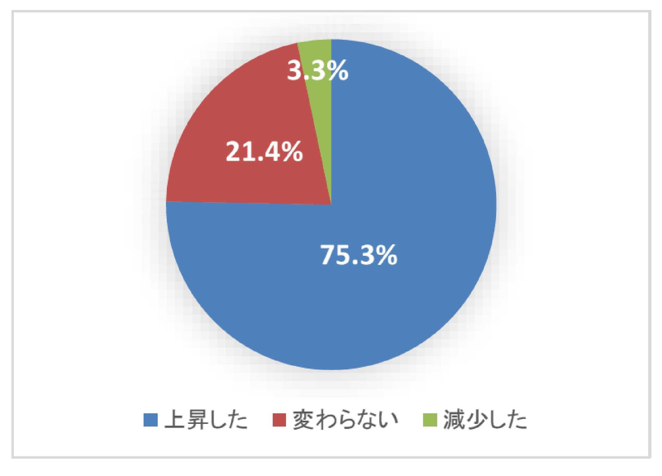 1年前からコストが上昇した企業は75.3%となり、収益に大きな影響を与えています。コストの中でも仕入価格が30%以上上昇したのは51.8%、エネルギー価格が30%以上上昇したのは35.8%、人件費が30%以上上昇したのは21.4%となり、仕入価格の上昇がコスト上昇の主な要因となっています。