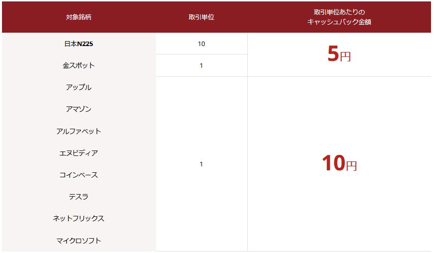 対象期間中の『CFDネクスト』における指定銘柄の新規注文の取引量に応じて、最大25万円をキャッシュバックいたします。人気銘柄の「日本N225」「金スポット」もキャッシュバック対象となっておりますので、この機会にぜひお試しください。