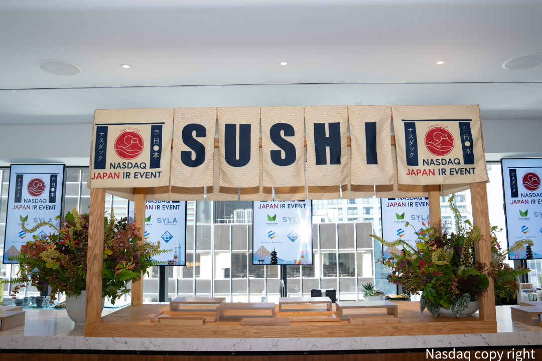 当イベントは、米国での日本企業のプレゼンスを上げることを目的とし、Nasdaqに上場する日本企業4社が集結し開催いたしました。イベント当日は、120名以上の投資家・メディアに参加をしていただき、各企業は企業ブースにてIRプレゼンテーションを行いました。プレゼンテーション後は、日本らしいテイストとして寿司ブースを設営し「OMOTENASHIパーティー」を実施いたしました。パーティーでは、より投資家と各社企業担当者が1on1でじっくり会話をして理解を深めて頂く機会の提供となり、日本文化と共に日本企業の魅力も発信をし、本イベントは大盛況となりました。