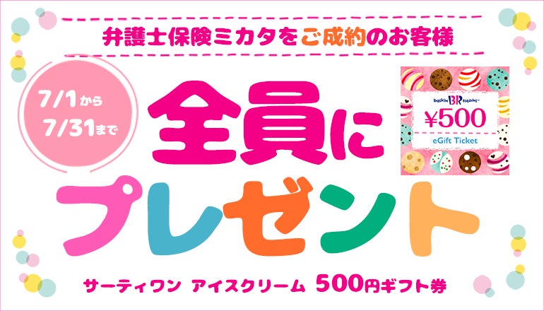 対象期間中に弁護士保険STATION経由で、ミカタ少額短期保険株式会社「弁護士保険ミカタ」の契約申込を完了し、ご契約が成立されたお客様全員に「サーティワン アイスクリーム 500円ギフト券」をプレゼントします。
