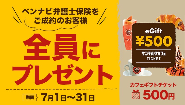 「ベンナビ弁護士保険」ご成約で「サンマルクカフェ カフェギフトチケット500円」もれなくプレゼント【弁護士保険STATION】