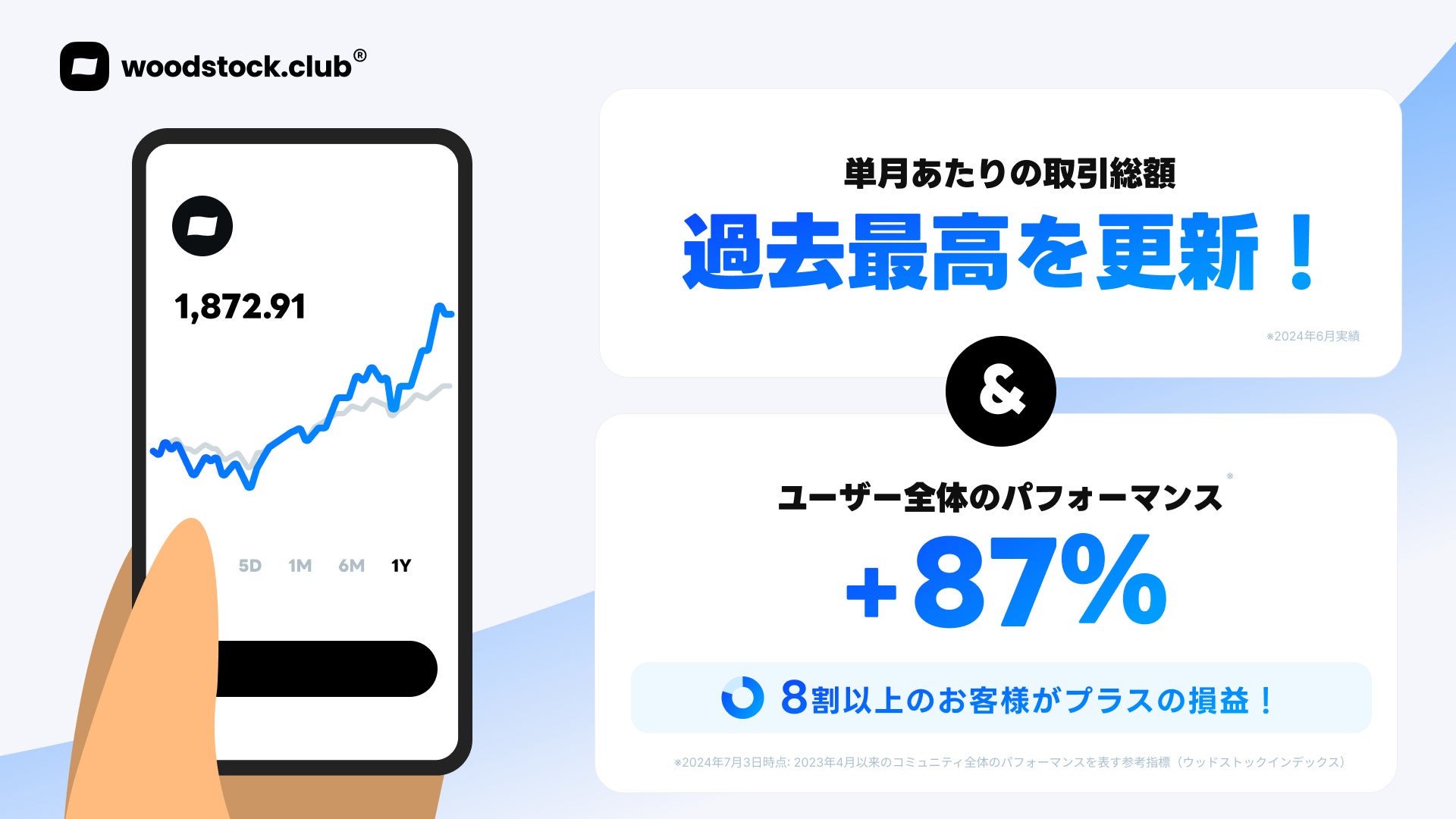 コミュニティを通じた全く新しい投資体験のなかで、いち早く情報に触れたり、他のユーザーの動向をみながら投資ができることで、利用者全体の損益率が非常にポジティブに推移しています。利用者全体の集合知としてのパフォーマンスを示す平均指標、ウッドストックインデックスにて、直近一年の平均リターンが+84%を記録、つまりウッドストック利用者が平均的にこの良いパフォーマンスの恩恵を受けていることになります。