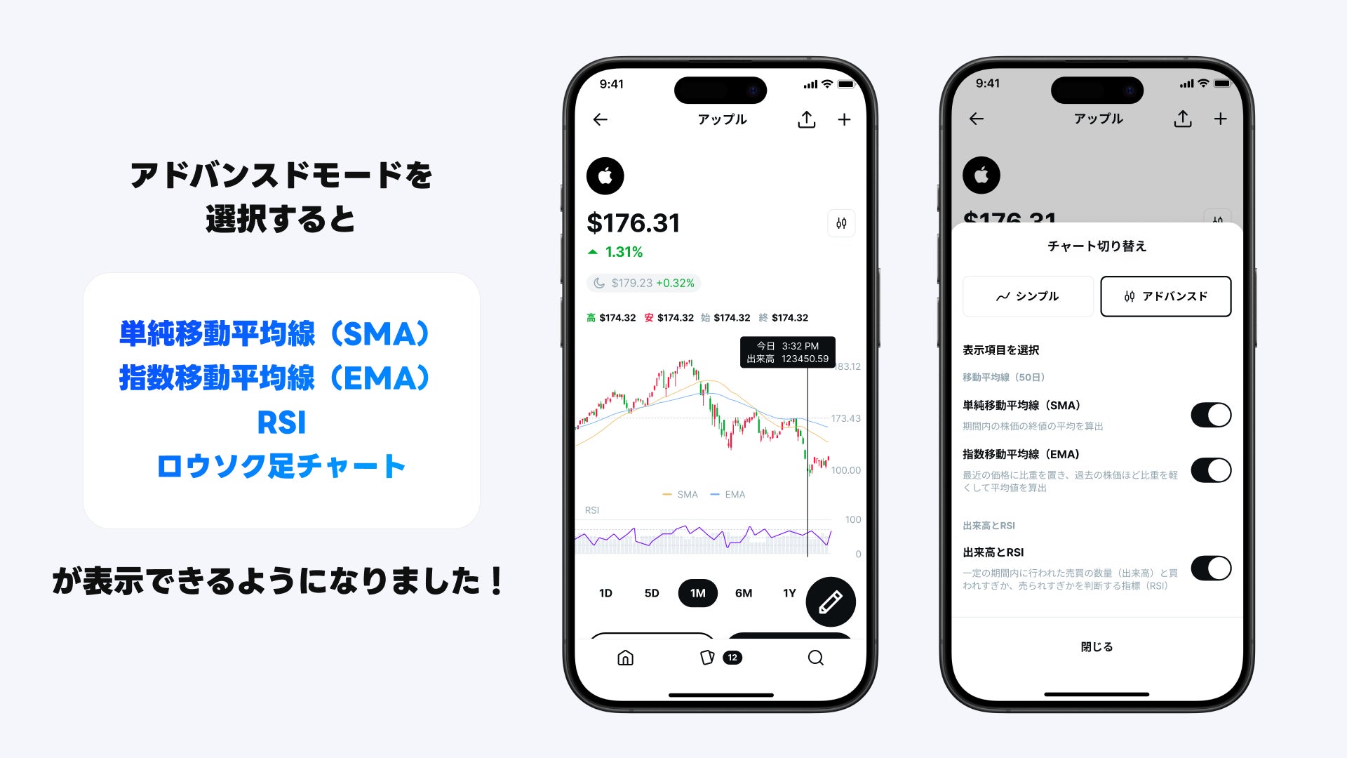 この度、各銘柄のチャートページを刷新し、パフォーマンスの改善を図ると共に、平均移動線やRSIなどテクニカルチャートの機能の提供を開始いたしました。初心者のみならず、経験のある投資家の皆様にもモバイルアプリを通じてより豊かな投資体験を楽しんでいただけます。元来、woodstock.clubにおいては、米国株やETFなどの約600銘柄を、全て1000円から購入いただけましたが、大口のお取引も日々増加しており、そういった経験豊かな投資家の皆様にとっても楽しんでいただけるアプリとして、これからも機能改善を続けて参ります。