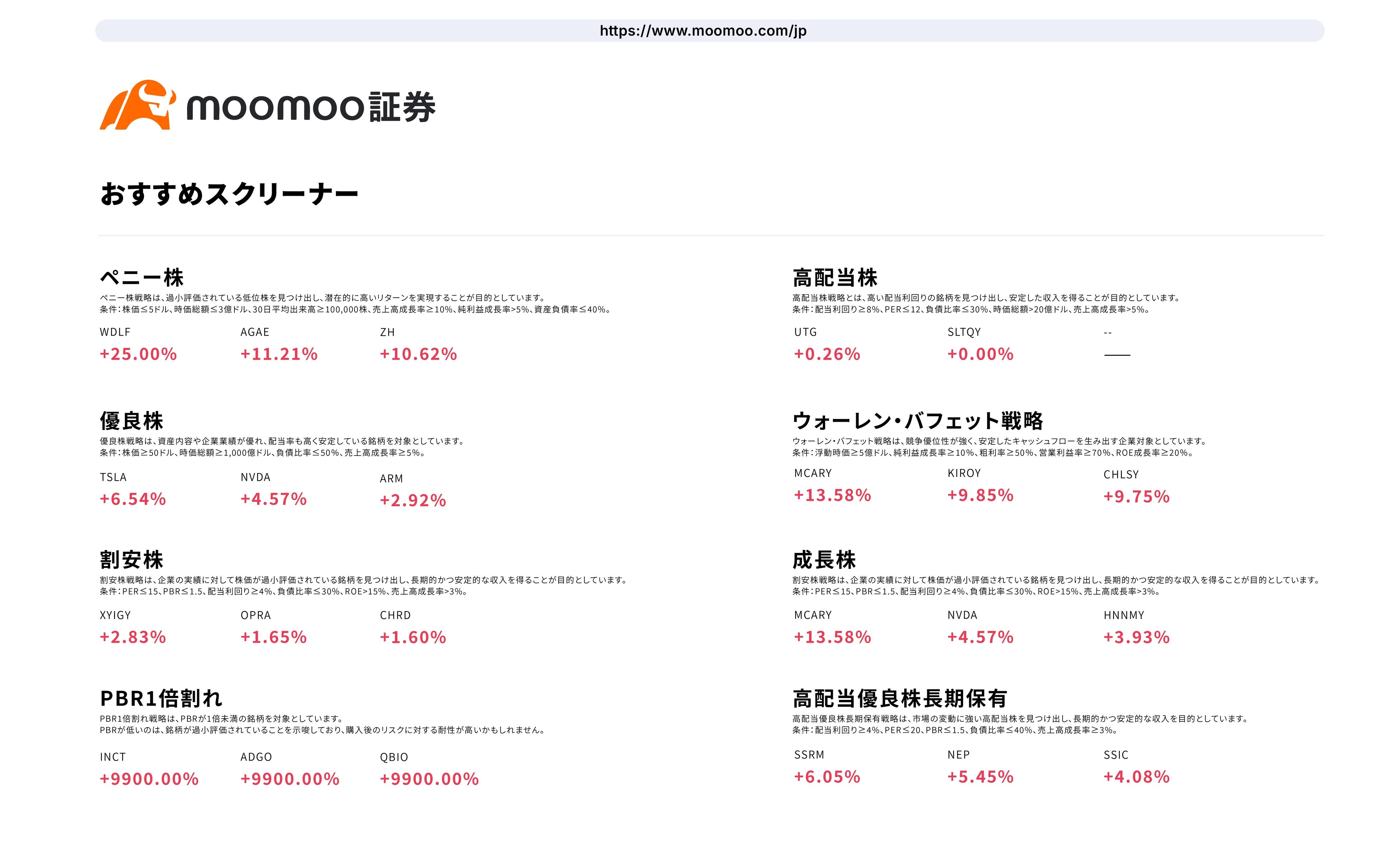 最先端のテクノロジーを駆使した「moomoo」アプリが提供するプロ並みのスクリーナー機能は、個人投資家の皆様がより確度の高い分析を行う有力ツールとしてご利用いただいておりますが、この度、スマホアプリで提供してきたスクリーニング機能を、無料でウェブユーザー様向けにもご提供いたします。