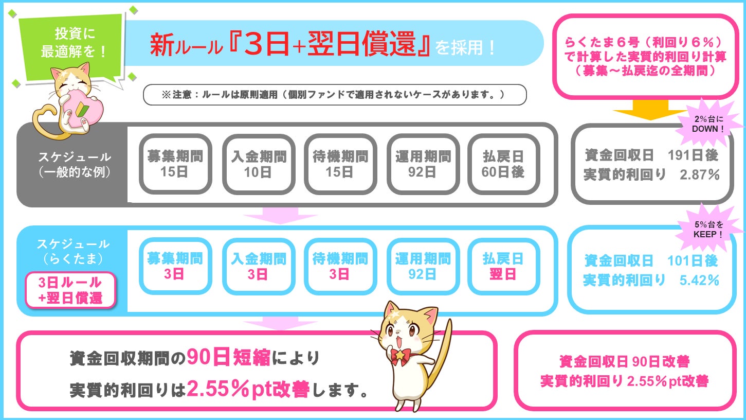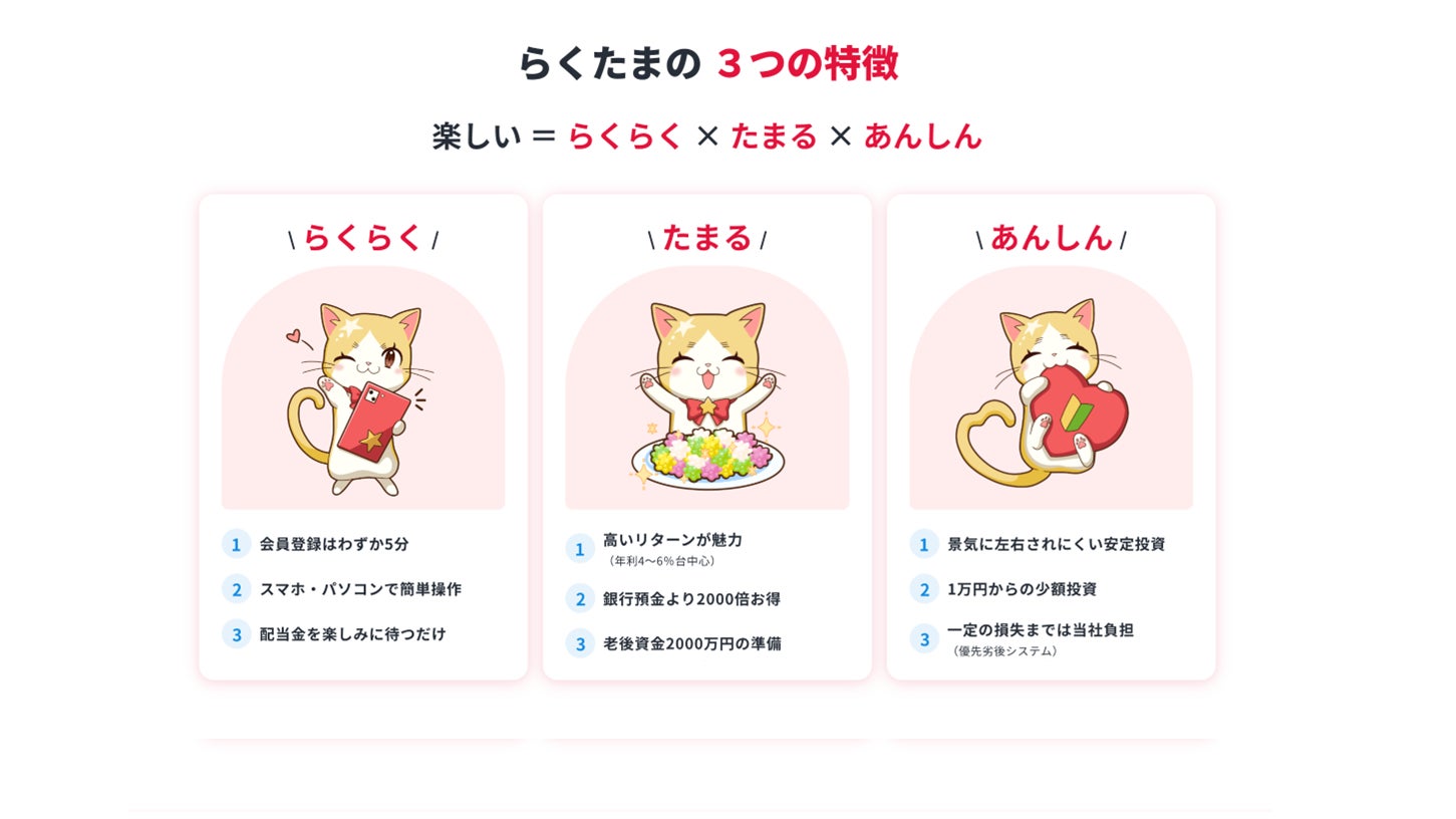 『らくに、たまる』をコンセプトに、不動産知識や投資経験が少ない方でも、1万円から楽しく安心して参加できるファンドをつくります。『らくたま』は投資家ファーストでいつも考えます。