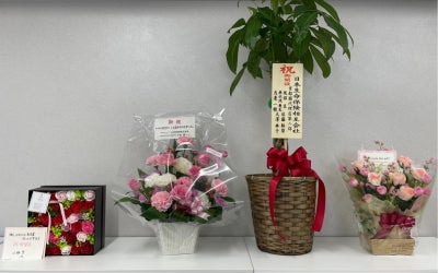 オフィスには、お取引先様からのお祝いのお花や、他セールスオフィス在籍のスタッフからもお祝いの品が続々と届き、棚が華やかに彩られました。