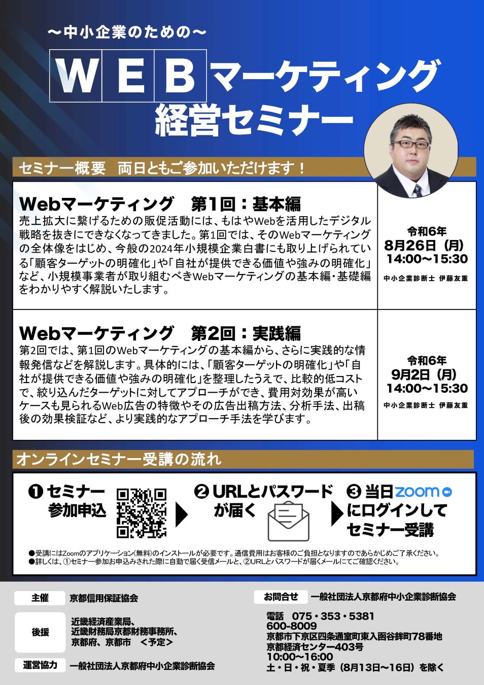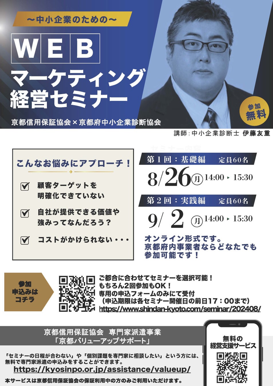 京都信用保証協会と(一社)京都府中小企業診断協会が連携し、京都府下の中小企業者を対象にオンラインセミナーを開催いたします。同セミナーでは、Webマーケティングの活用により、経営資源をより効果的に活用し、売上の増加を図ることを目的に、基本編と実践編の2回に分け、本分野に精通した中小企業診断士が講演をいたします!