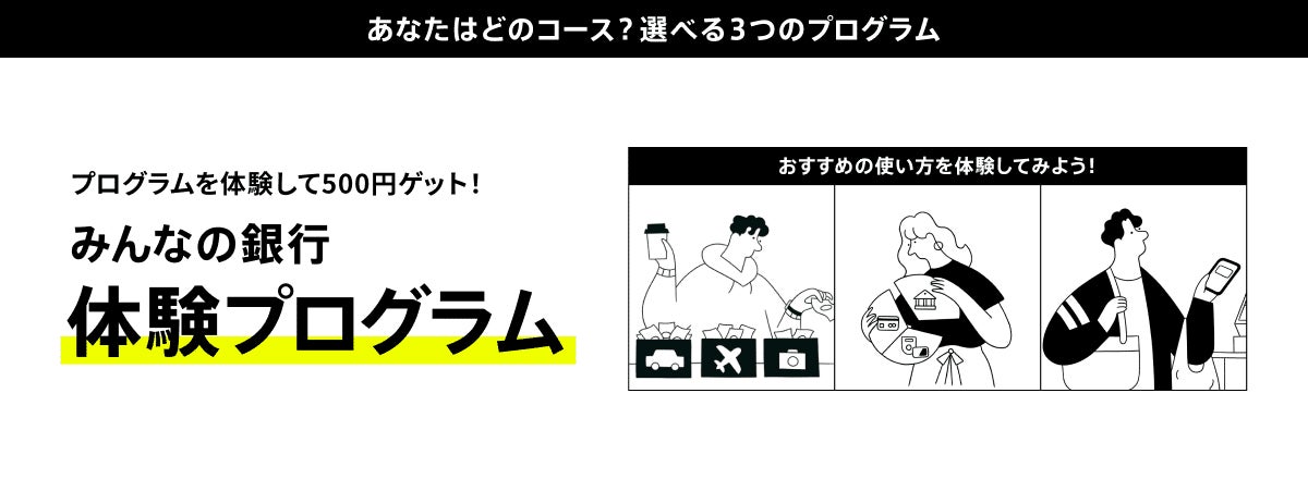 本プログラムは、お客さまのライフスタイルや使い方に合わせてみんなの銀行をご活用いただけるよう、口座開設後におすすめの使い方をお得に体験いただくプログラムです。みんなの銀行で新たに口座開設した方を対象に、ご用意した3つのコースからお好きなコースを一つお選びいただき、条件を達成した方には現金500円をプレゼントします。