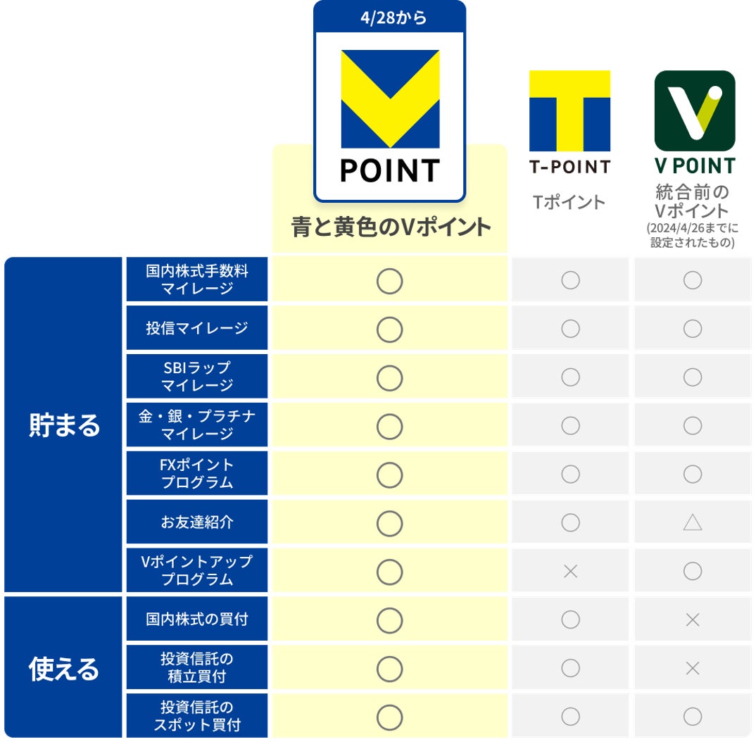 2024年4月に、CCCMKホールディングスが提供する「Tポイント」とSMBCグループが提供する「Vポイント」が統合して「青と黄色のVポイント」が誕生したことに伴い、SBI証券では、「青と黄色のVポイント」が貯まる・使える「SBI証券Vポイントサービス」として、SBI証券でのポイントサービスをさらに使いやすくリニューアルしました。
