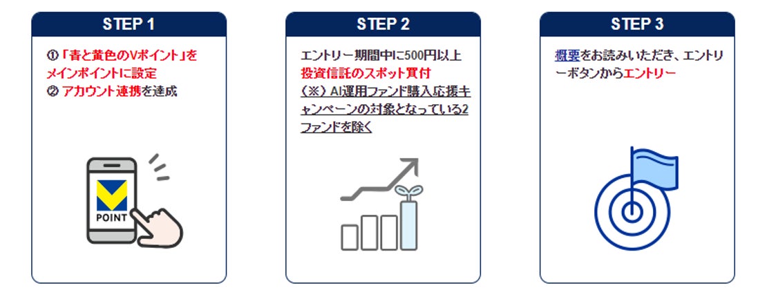 ①「青と黄色のVポイント」をメインポイントに設定の上、アカウント連携 (Vポイントカード登録) ※ 本キャンペーンのエントリー期間前に「青と黄色のVポイント」のメインポイント設定とアカウント連携を達成されていた場合でも、本キャンペーンのエントリー対象となります。 ※ 三井住友カードVポイント認証(Vpass/SMBC ID登録)の連携を達成している場合でも、Vポイントカード登録が未完了の場合は対象外となります。 ※ 「青と黄色のVポイント」のメインポイント設定、アカウント連携が不可の口座 (メインポイントが限定されている一部仲介口座等) のお客さまは対象外となります。 ※ インターネットコースの個人のお客さまのみ対象です。 ※ 法人口座のお客さまは本キャンペーンの対象外となります。 ※ ダイレクト、IFA、対面コースのお客さまは対象外となります。 ②キャンペーン期間中、投資信託のスポット買付を合計500円以上実施 ※ NISA (成長投資枠) での買付も対象となります。 ※ 取引は約定日ベースで判定を行います。 ※ 「青と黄色のVポイント」を利用した買付についても算定対象となります。 ※ MMF、中国F、MRF、外貨建MMF、ETF、REIT、外国籍投資信託、SBIラップ専用ファンドおよびAI運用ファンド購入応援キャンペーンの対象となっている2ファンド(「ROBOPROファンド」、「SBI岡三 NASDAQ AIアクティブファンド」)は対象外となります。 ③SBI証券のキャンペーンページよりエントリーボタンを押下 |
